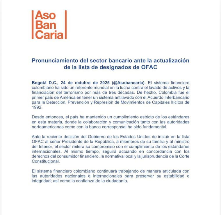 Frente a la reciente decisión de Washington de incluir en la lista al presidente Petro, a su entorno familiar y al ministro Benedetti, el gremio insistió en su compromiso con el cumplimiento de los estándares internacionales y explicó que las entidades deberán bloquear los activos y las cuentas de los designados, en concordancia con la normativa local y la jurisprudencia de la Corte Constitucional.