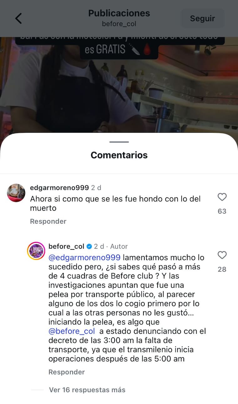 “Lamentamos mucho lo sucedido, pero ¿sí sabes que pasó a más de 4 cuadras de Before Club? Y las investigaciones apuntan que fue una pelea por transporte público, al parecer alguno de los dos lo cogió primero, por lo cual a las otras personas no les gustó... iniciando la pelea", respondió la discoteca.