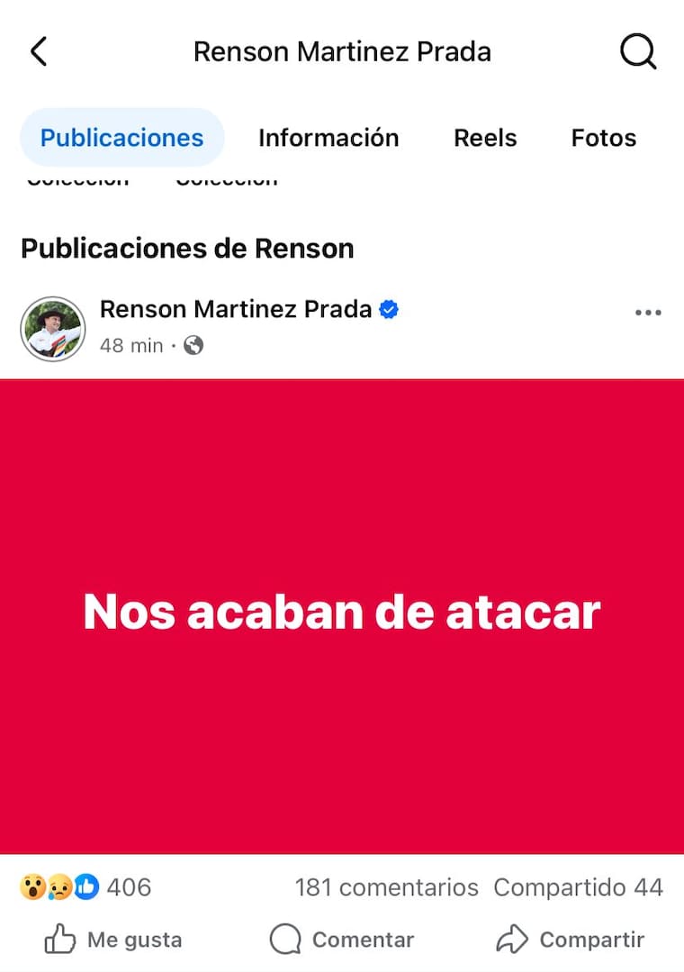 El mandatario departamental informó sobre el atentado a través de su cuenta oficial de Facebook: “Nos acaban de atacar”, publicó hacia las 11:00 a. m. en la red social.