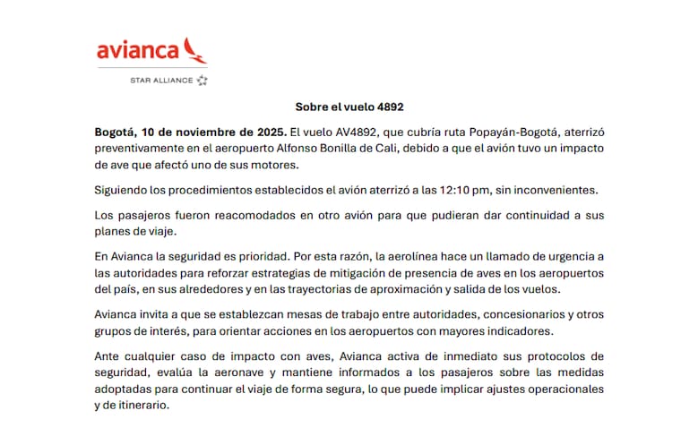 El caso en el vuelo AV4892 se registró hacia el mediodía de este lunes 10 de noviembre y generó gran preocupación entre los pasajeros y alerta en la operación aérea.