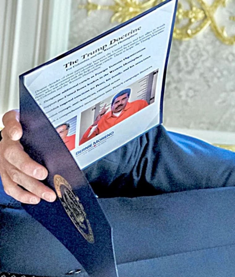 La fotografía, que pasó desapercibida hasta que la revista ‘Cambio’ la publicó, fue difundida inicialmente en la galería oficial de la Casa Blanca como parte del registro de una reunión de congresistas republicanos en la sede del Ejecutivo, el pasado 21 de octubre. En la imagen se ve al subjefe de gabinete, James Blair, sosteniendo una carpeta abierta que deja ver un documento del senador Bernie Moreno que lleva como título: “La doctrina Trump para Colombia y el hemisferio occidental”.
