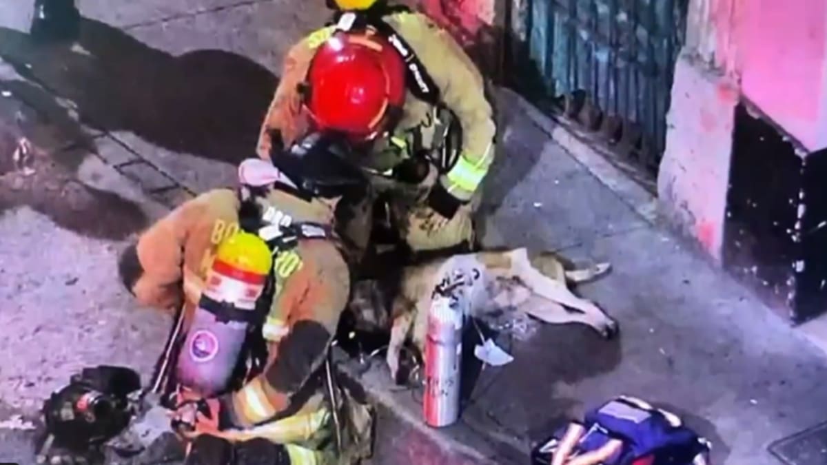 Durante la intervención, los bomberos realizaron un emotivo rescate de un perro que se encontraba atrapado dentro del establecimiento y logró ser sacado con vida tras varios minutos de maniobras.
