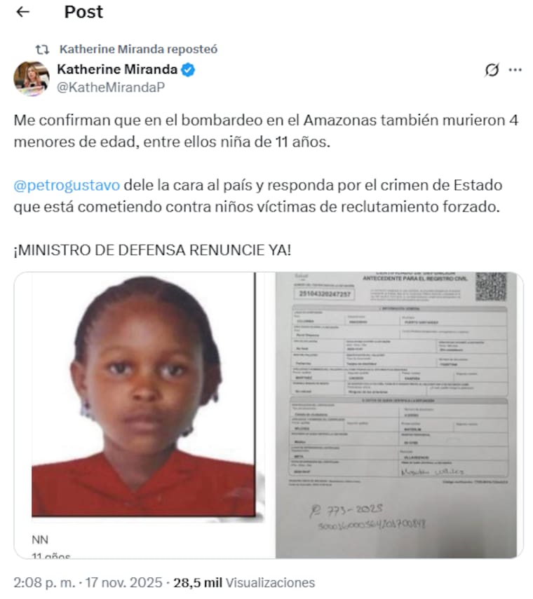 “Me confirman que en el bombardeo en el Amazonas también murieron cuatro menores de edad, entre ellos niña de 11 años. Gustavo Petro, dele la cara al país y responda por el crimen de Estado que está cometiendo contra niños víctimas de reclutamiento forzado”, señaló la congresista en su cuenta de X.