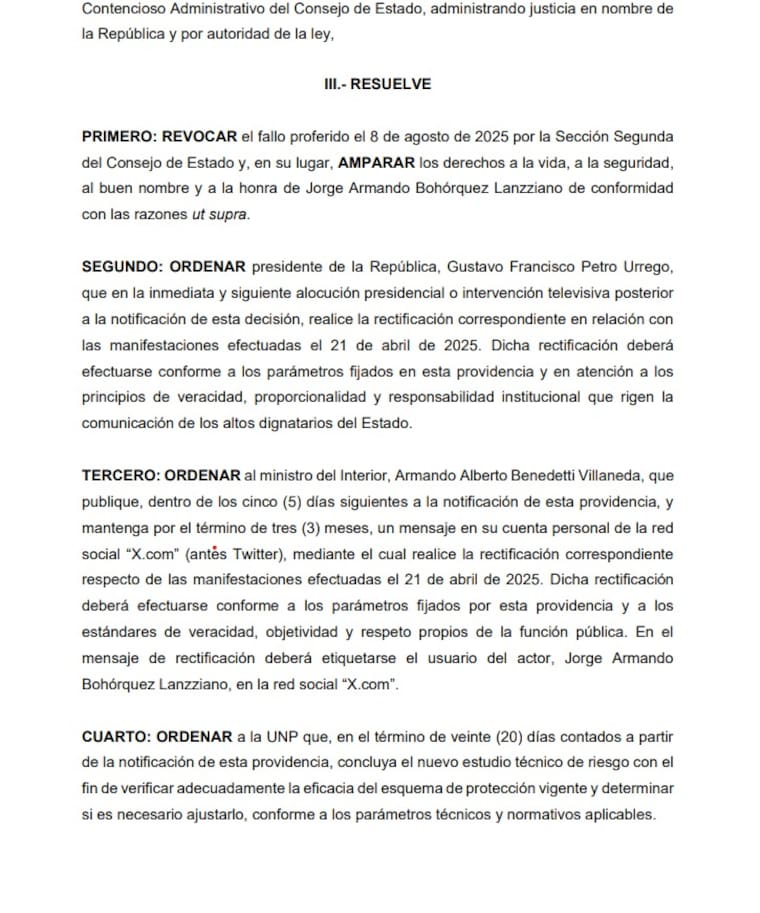 En consecuencia, el Consejo de Estado ordenó que el presidente realice una rectificación pública en su próxima intervención oficial y que Benedetti publique un mensaje rectificatorio en su cuenta de X, el cual deberá permanecer visible por tres meses y mencionar a Jorge Armando Bohórquez.