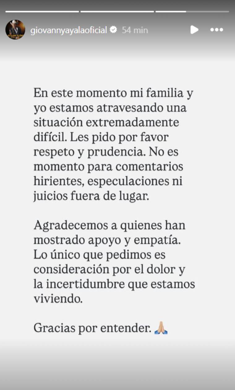 “En este momento mi familia y yo estamos atravesando una situación extremadamente difícil. Les pido por favor respeto y prudencia. No es momento para comentarios hirientes, especulaciones ni juicios fuera de lugar”, se lee en parte del mensaje.