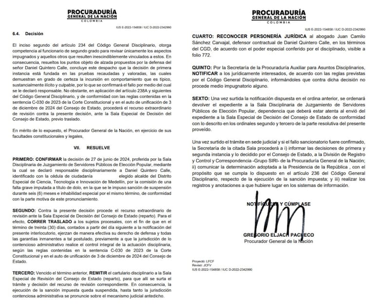 En la decisión en segunda instancia se lee: “CONFIRMAR la decisión de 27 de junio de 2024, proferida por la Sala Disciplinaria de Juzgamiento de Servidores Públicos de Elección Popular, mediante la cual se declaró responsable disciplinariamente a Daniel Quintero Calle, identificado con la cédula de ciudadanía... elegido alcalde del Distrito Especial de Ciencia, Tecnología e Innovación de Medellín, por la comisión de una falta grave imputada a título de dolo, en la que se le impuso sanción de suspensión durante seis (6) meses e inhabilidad especial por el mismo término, de conformidad con la parte motiva de este pronunciamiento”.