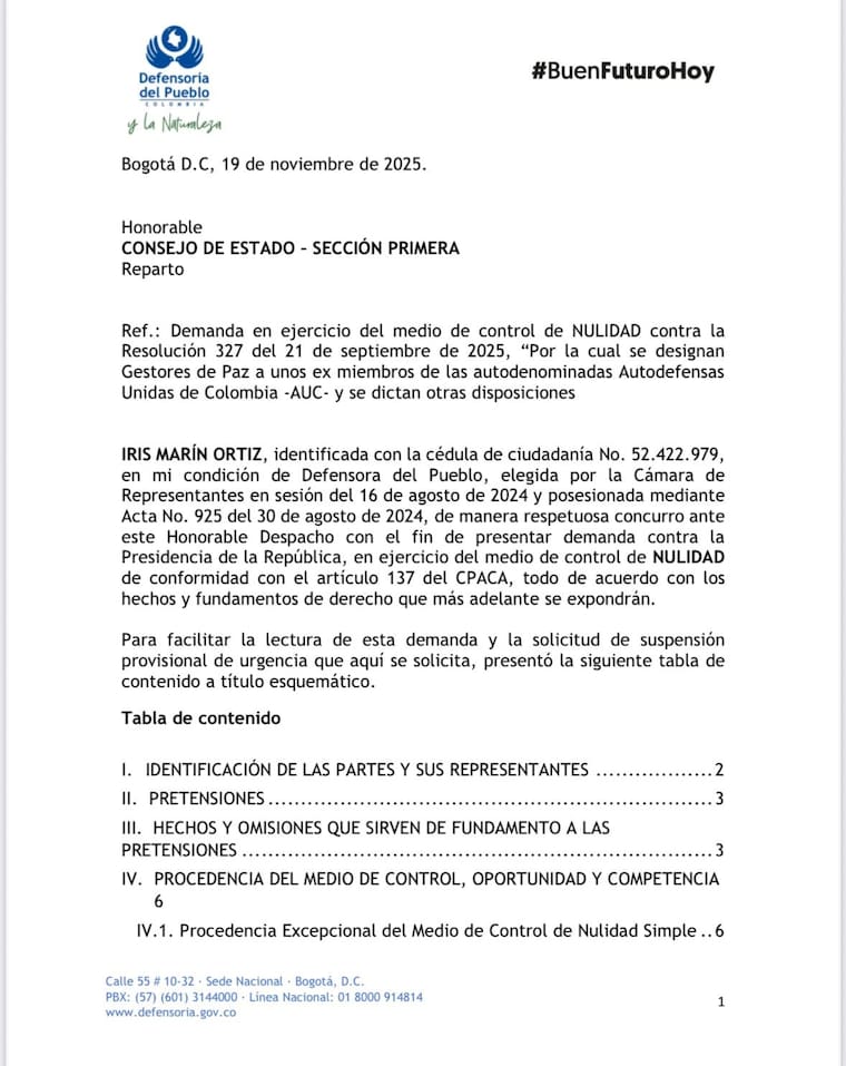 La demanda, instaurada por la defensora Iris Marín, también señala: “En el presente caso la necesidad de la suspensión provisional que se solicita radica en los graves efectos que en el plano político y social genera la vigencia y aplicación de la Resolución demandada, en cuanto concede el estatus de gestores de paz, con la significativa carga axiológica positiva que ello evoca y el importante poder de intervención que conforme al contenido de esta resolución el conlleva, a 16 personas que hicieron parte de grupos armados al margen de la ley”.