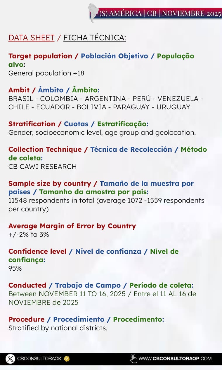 CB Consultora Opinión Pública fue la encargada de la encuesta que coloca al presidente de Bolivia, Rodrigo Paz, como el mejor valorado con 51,7 % de imagen positiva; en segundo lugar se ubica Luiz Inácio Lula da Silva, de Brasil, con 48,5 %; y cierra el podio Javier Milei, de Argentina, con 47,2 % de aprobación.