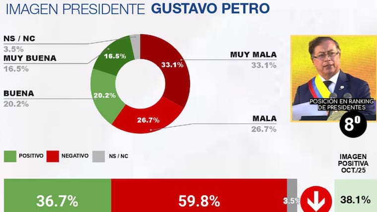 Cabe destacar que la encuesta fue realizada a una muestra de 1.188 personas entre el 11 y 16 de noviembre en Colombia y que dejó como resultado detallado los siguientes números: percepción muy mala, 33.1 %; percepción mala, 26.7 %; percepción buena, 20.2%; percepción muy buena, 16.5 %; no sabe no responde, 3.5 %.