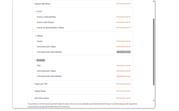 En un enlace que la misma plataforma de Nequi, que sirve para verificar el correcto funcionamiento de los diferentes servicios que ofrece, se lee que todos estos están con “interrupción parcial”.