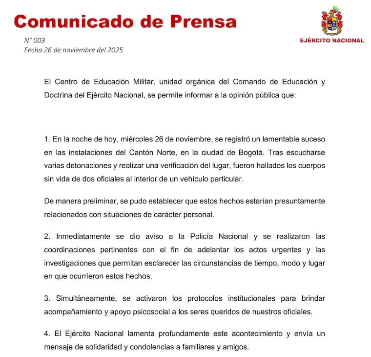 A su vez, el Ejército manifestó que se dispuso acompañamiento psicosocial para los familiares de los dos oficiales y expresó sus condolencias por la tragedia.