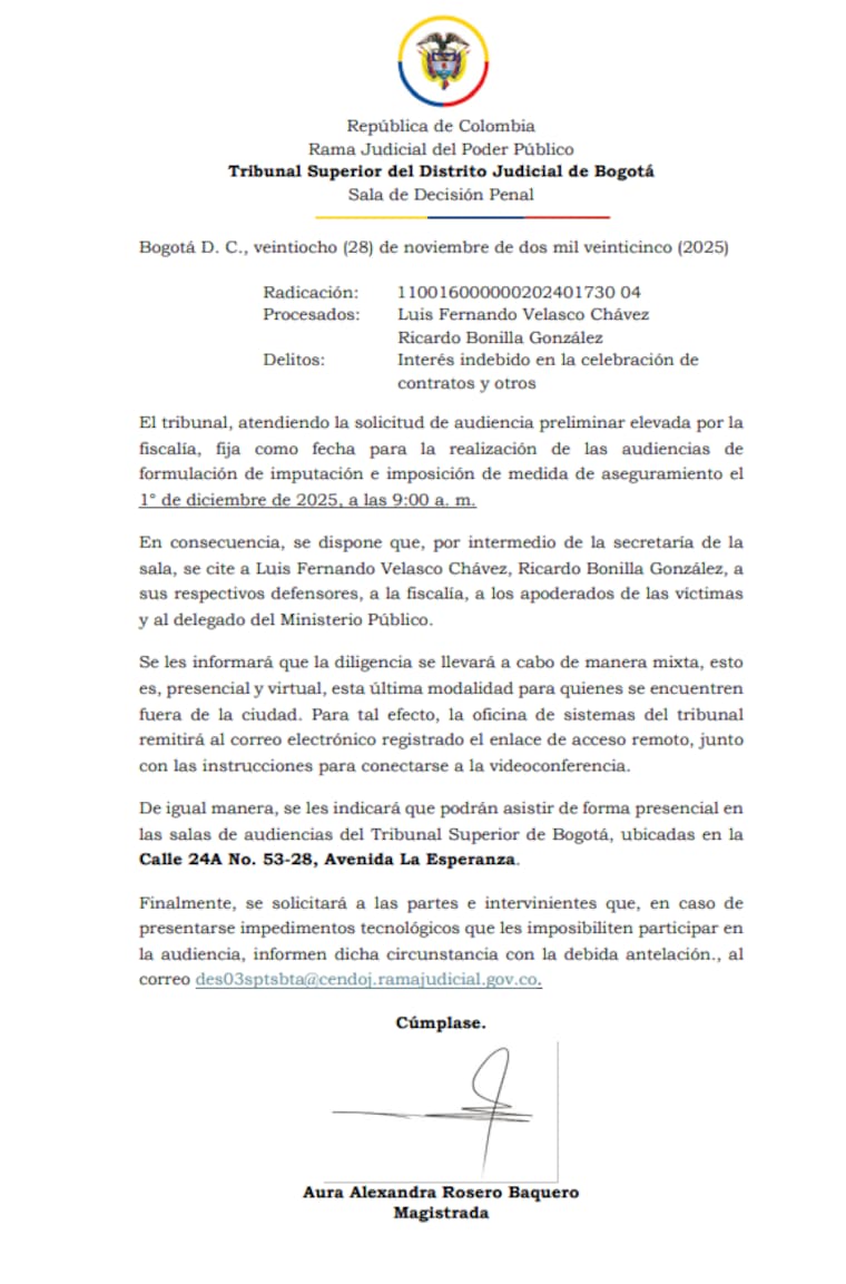 Este viernes 28 de noviembre se conoció la fecha que fijó el Tribunal Superior de Bogotá para que se lleve a cabo la audiencia de formulación de imputación de cargos y solicitud de medida de aseguramiento contra los ex ministros de Hacienda e Interior, Ricardo Bonilla, y Luis Fernando Velasco, respectivamente.
