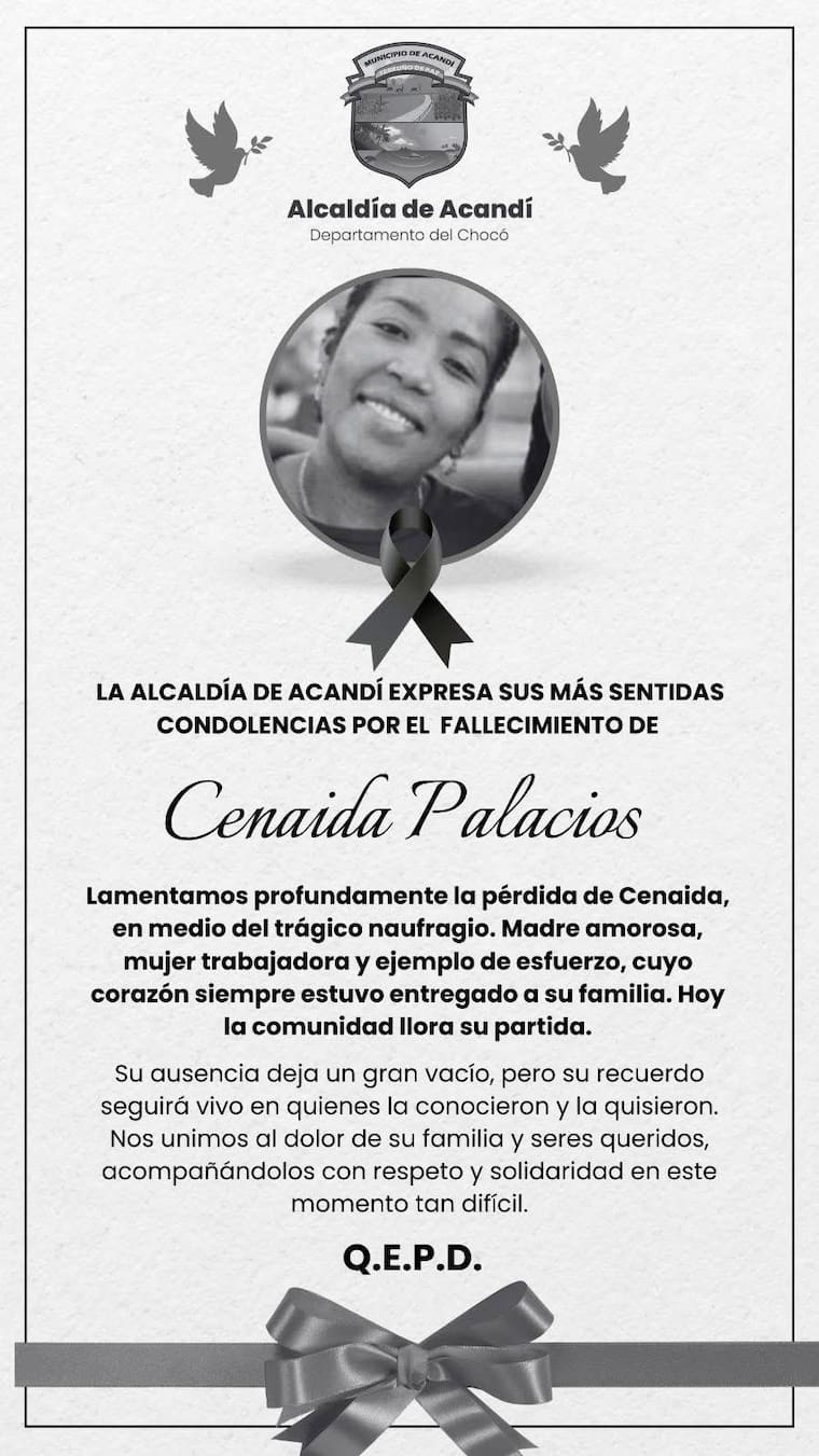 “Hoy Acandí amaneció con un nudo en el alma. El naufragio ocurrido nos arrebató a Cenaida Palacios y a la pequeña Hillary, dejando un vacío que cala hondo. Cenaida fue corazón y motor en los grados realizados ayer en la institución educativa Diego Luis Córdoba, apoyó incondicionalmente cada detalle, cada actividad, cada paso. Se fue siendo una servidora entregada a su comunidad, una mujer que sostenía, acompañaba y hacía que las cosas sucedieran”, se lee en un comunicado de la Alcaldía de Acandí.
