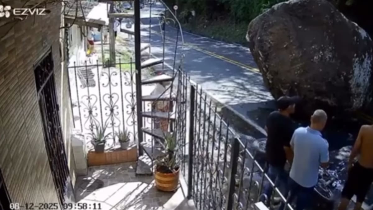 La escena quedó registrada en cámaras de seguridad de la zona. En el video puede observarse el momento exacto en el que varias motos se desplazaban por la vía, y de repente se frenaron, logrando esquivar la enorme piedra segundos antes de que cayera sobre ellos.