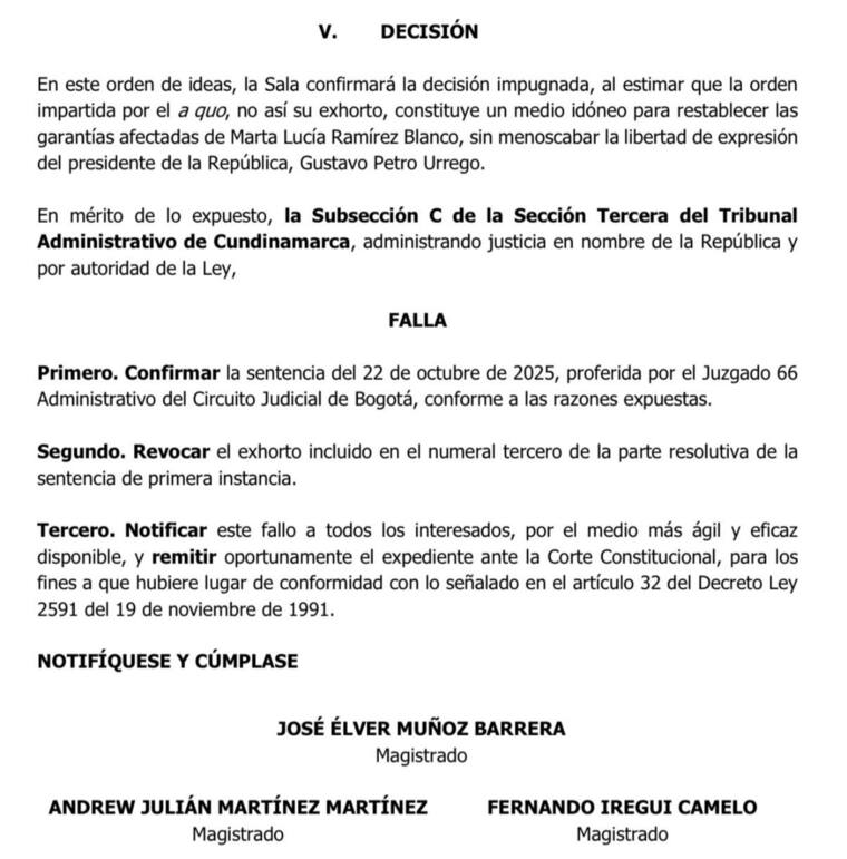 El Tribunal de Cundinamarca dejó en firme, en segunda instancia, la orden de rectificación al presidente Gustavo Petro por señalamientos hechos contra la excanciller Marta Lucía Ramírez.