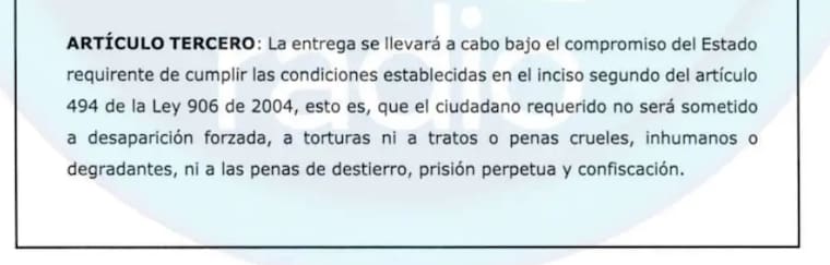 Asimismo,la resolución enfatiza que la entrega se llevará a cabo bajo el compromiso de que Estados Unidos cumpla con las condiciones establecidas en el artículo 494 de la Ley 906 de 2004, que señala que Rojas no podrá ser sometido a desaparición forzada, torturas ni a penas crueles, inhumanas o degradantes, así como tampoco a las penas de destierro, prisión perpetua y confiscación.