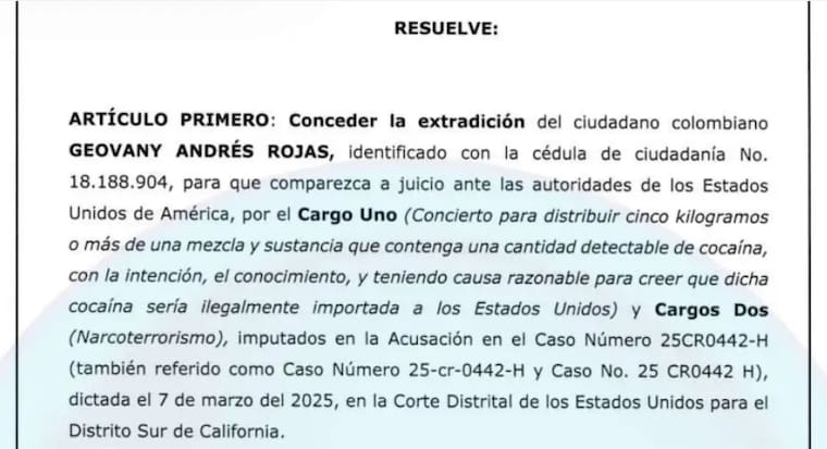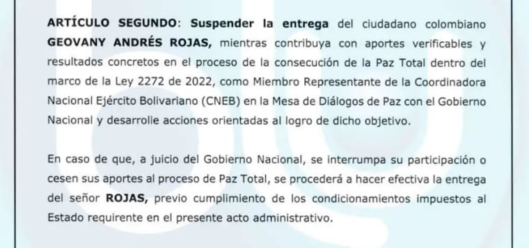 Sin embargo, el artículo segundo de la resolución establece la suspensión de la entrega de Rojas mientras este “contribuya con aportes verificables y resultados concretos en el proceso de la consecución de la paz total”, en el marco de la Ley 2272 de 2022.