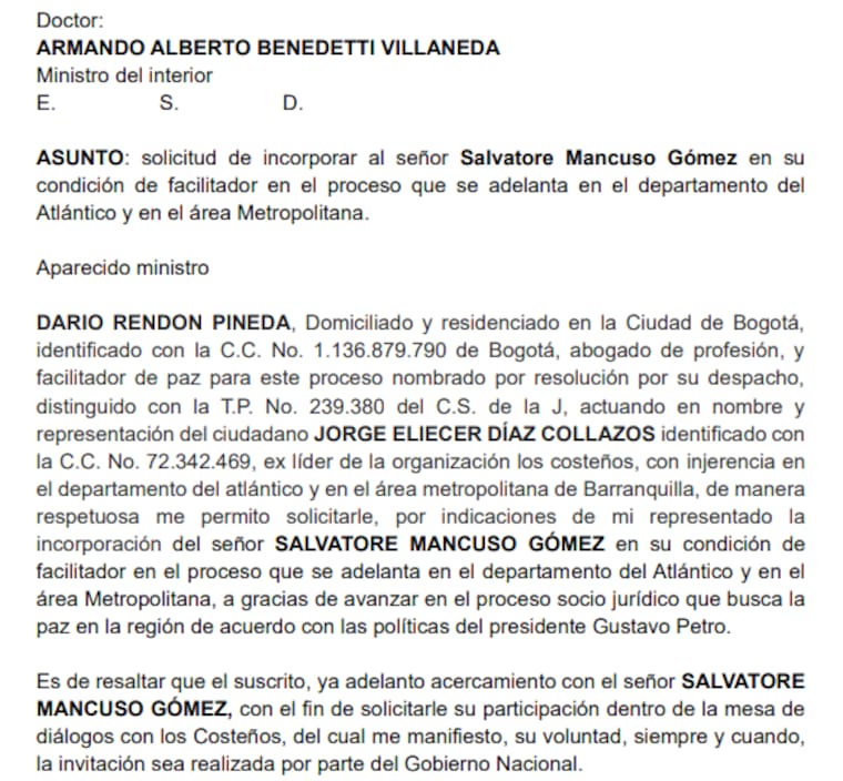 El asunto del comunicado señala: “Solicitud de incorporar al señor Salvatore Mancuso Gómez en su condición de facilitador en el proceso que se adelanta en el departamento del Atlántico y en el área Metropolitana”.