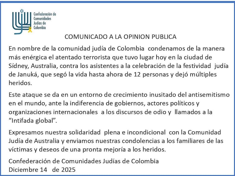 La Confederación de Comunidades Judías de Colombia emitió este domingo un comunicado en el que condenó el ataque terrorista perpetrado en la noche del sábado en una popular playa de Sídney, Australia, con un saldo hasta el momento de 12 muertos -incluido uno de los tiradores- y 29 heridos.