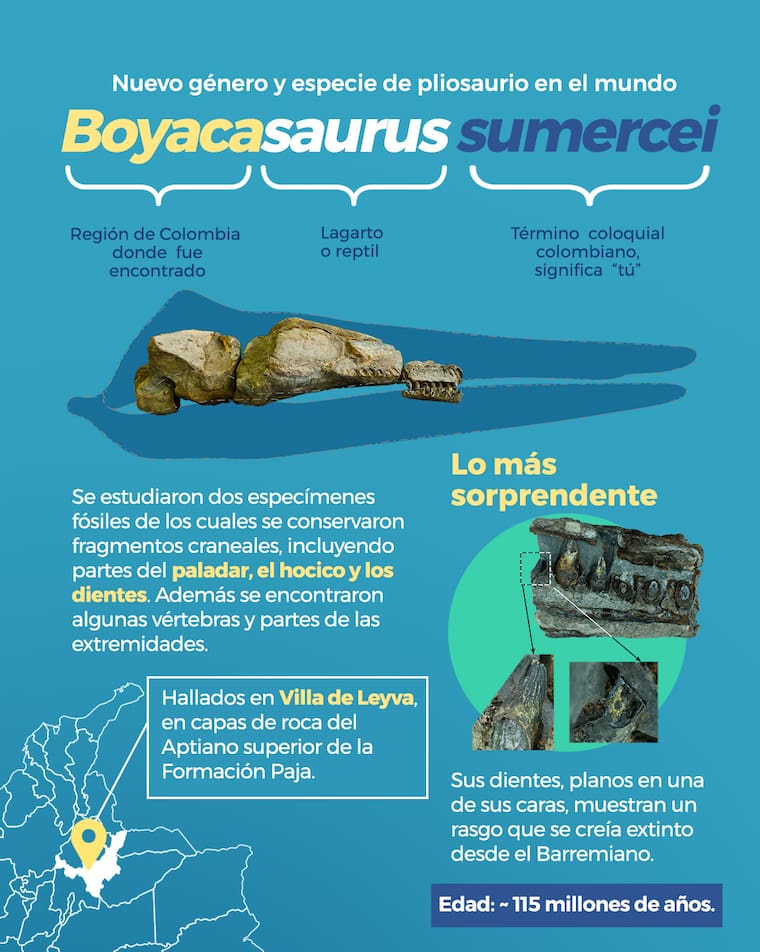Entre los descubrimientos destaca una nueva especie de pliosaurio de hocico largo (Plesiosauria, Pliosauridae), bautizada científicamente como ‘Boyacasaurus sumercei’.