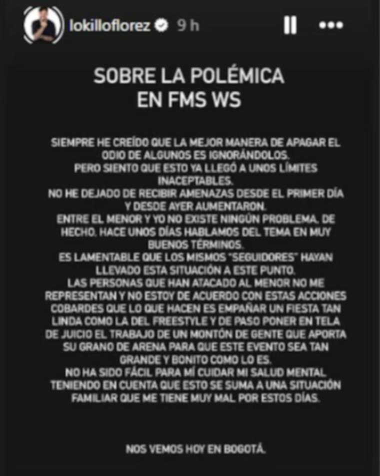 Por todo esto, Lokillo publicó un mensaje en sus redes sociales lamentando que todo esto de “la fiesta del freestyle” se haya convertido en amenazas de unos contra otros.