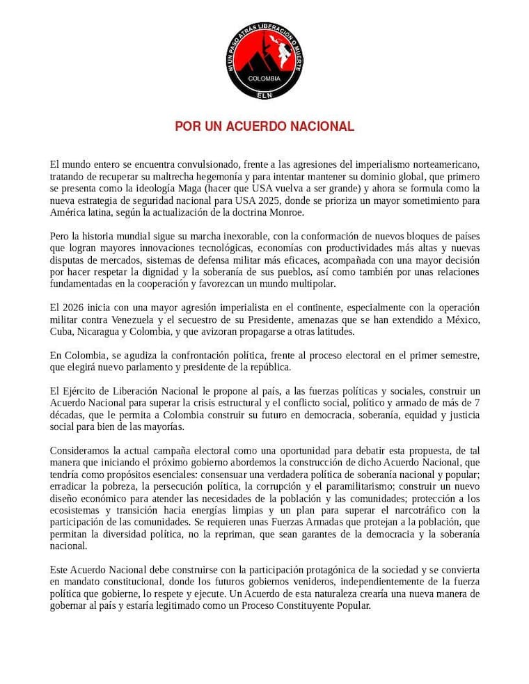 “El Ejército de Liberación Nacional le propone al país, a las fuerzas políticas y sociales, construir un Acuerdo Nacional para superar la crisis estructural y el conflicto social, político y armado de más de siete décadas, que le permita a Colombia construir su futuro en democracia, soberanía, equidad y justicia social para bien de las mayorías”, señaló la Delegación de Paz en un comunicado.
