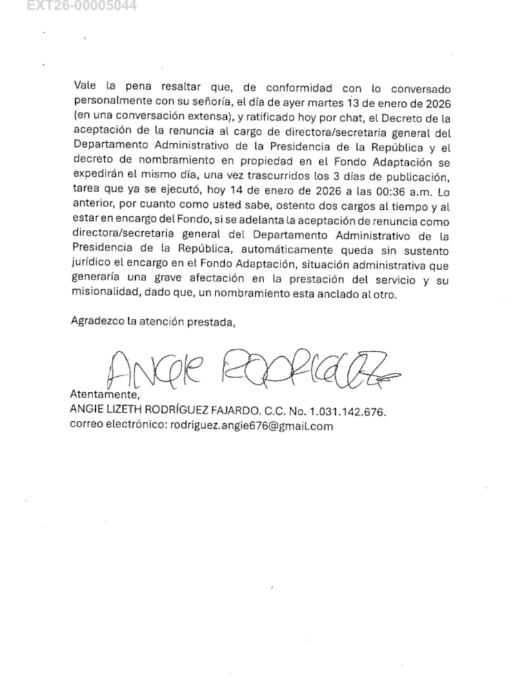 Por medio de una publicación en la cuenta de X del Departamento Administrativo de la Presidencia, Dapre, Angie Rodríguez anunció que renunció a la dirección de la entidad, para asumir en propiedad como gerente del Fondo Adaptación.