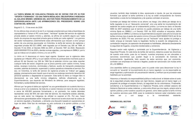 Los gremios aseguran que se induce en un error, pues “en Colombia, la tarifa del servicio de vigilancia y seguridad privada NO ES LIBRE, está regulada por el Decreto Ley 356 de 1994, el Decreto 73 de 2002, el Decreto 4950 de 2007, el Decreto 1561 de 2022 , Resolución 20251000059517CS de 2025 y demás normas vigentes, y se expresa en SMMLV, por lo que se indexa con el salario mínimo y no con el IPC”.