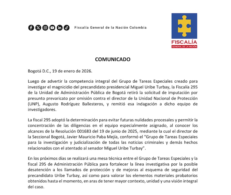 La Fiscalía General de la Nación reversó la imputación de cargos contra el director de la UNP, Augusto Rodríguez, por el magnicidio del senador y precandidato presidencial, Miguel Uribe Turbay, registrado en 7 de junio del 2025, cuando el político se encontraba en el barrio Modelia, en la localidad de Fontibón, en Bogotá.