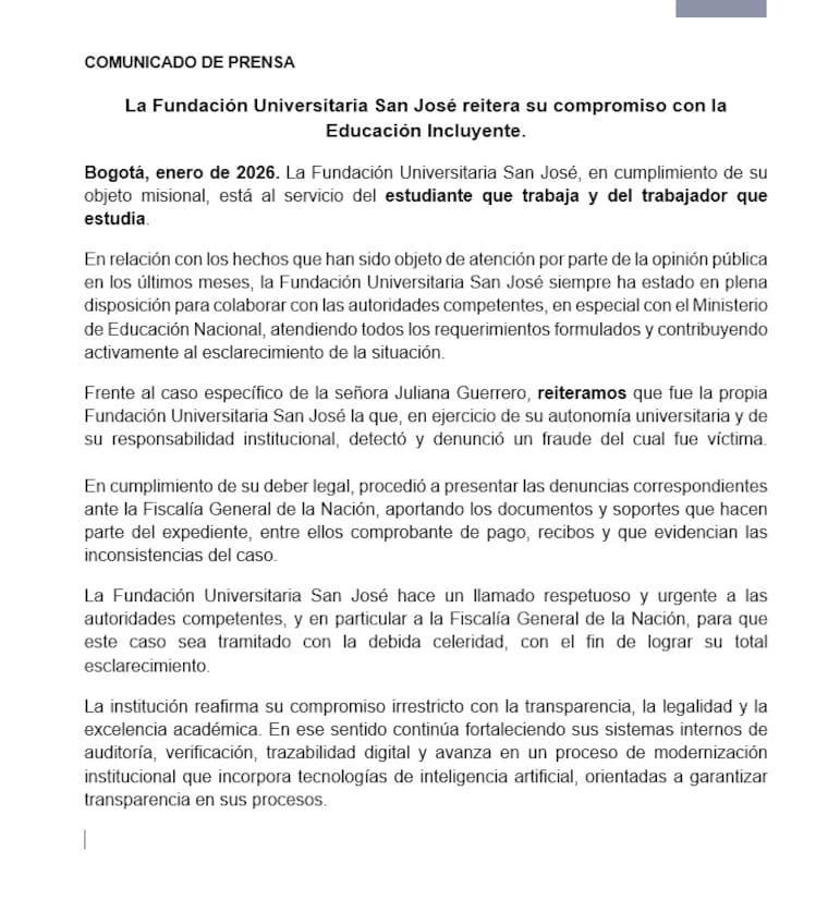 En medio de todo el revuelo que causó la denuncia de la representante Jennifer Pedraza, del Partido Dignidad, contra la ex aspirante a viceministra de Juventud, Juliana Guerrero, por supuesto fraude o falsedad de los títulos universitarios de la ex funcionaria del Gobierno Petro, este viernes se conoció un nuevo pronunciamiento de la institución involucrada: Fundación Universitaria San José.