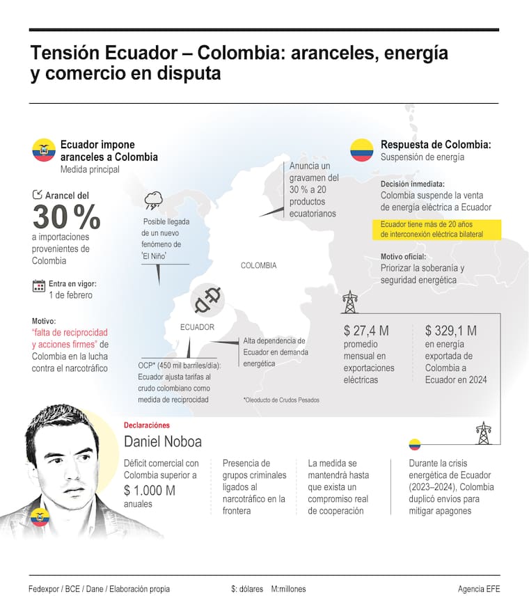 Los dos países atraviesan una escalada de tensiones luego de que Noboa anunciara aranceles del 30 % a productos colombianos a partir del 1 de febrero, alegando falta de cooperación en la lucha contra el narcotráfico, medida a la que Bogotá respondió con tarifas recíprocas y la suspensión de las exportaciones de electricidad.