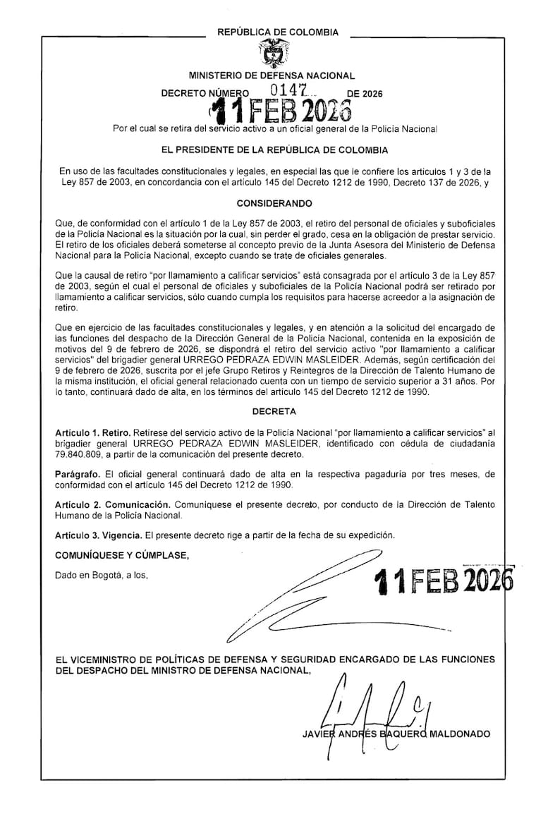Para ello, el Gobierno expidió el Decreto 0147 para el retiro del servicio activo del brigadier general Urrego Pedraza, firmado este 11 de febrero por el viceministro de Políticas de Defensa y Seguridad, encargado de las funciones del Ministerio de Defensa, Javier Andrés Baquero.