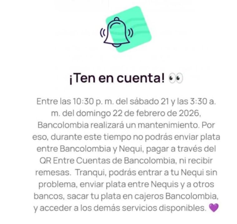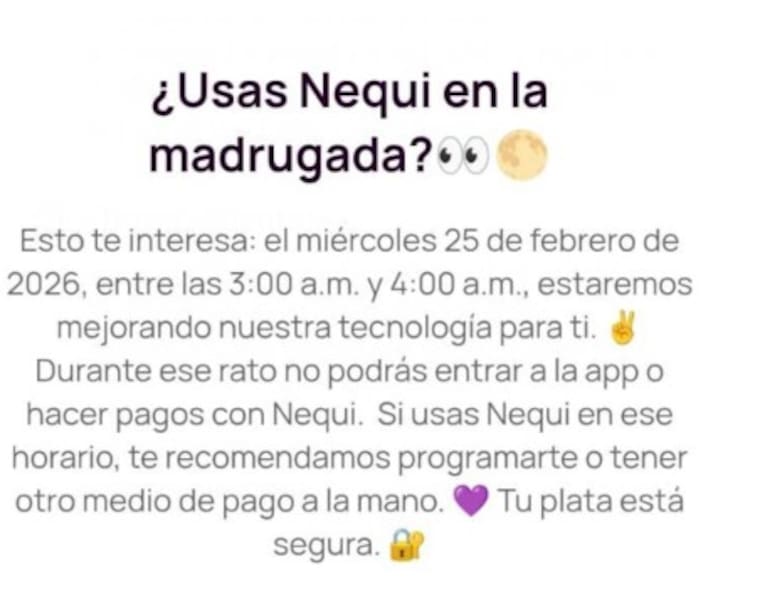 Además de este mantenimiento, Nequi confirmó que el miércoles 25 de febrero, entre las 3:00 a. m. y 4:00 a. m., realizará otra actualización que impedirá temporalmente el inicio de sesión y la realización de pagos.