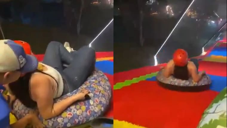 En video quedó registrado el momento en que la mujer se lanzó del “tobogán extremo” con ayuda de un trabajador del establecimiento rural, sin embargo, perdió el control del neumático y terminó saliéndose de la estructura.
