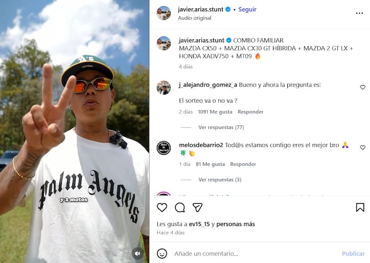 En sus plataformas promocionaba rifas de vehículos, motocicletas y otros bienes de alto valor. En su última publicación, el influencer presentó lo que llamó un “combo familiar”, que incluía tres carros y dos motos como premio para quienes participaran en el sorteo.