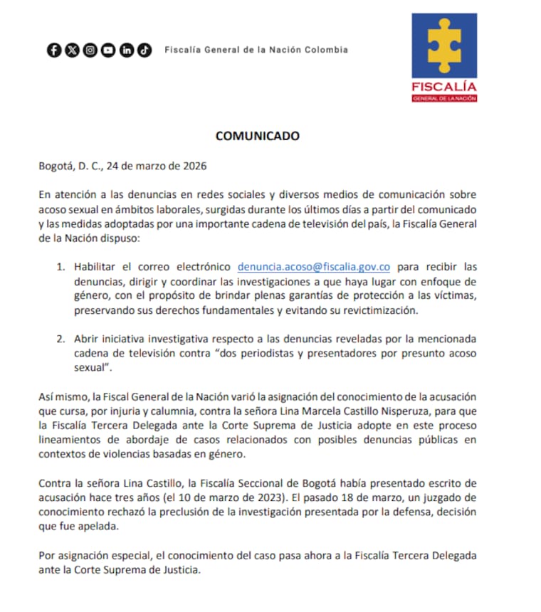 La Fiscalía General de la Nación dio a conocer la apertura de una línea investigativa tras las denuncias de presunto acoso sexual reveladas por Caracol Televisión, en las que estarían involucrados dos periodistas y presentadores.