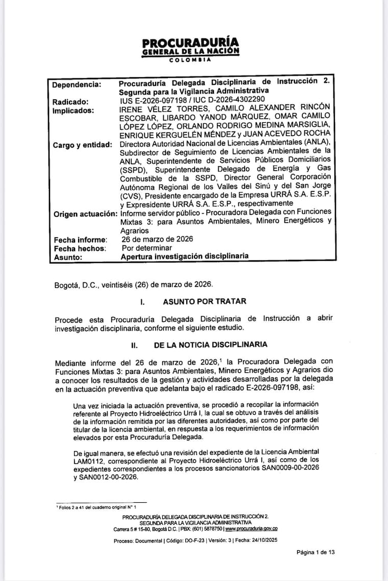 La decisión, adoptada el 26 de marzo de 2026, también incluye a otros seis funcionarios y exfuncionarios de entidades como la ANLA, la Superintendencia de Servicios Públicos Domiciliarios (SSPD), la Corporación Autónoma Regional de los Valles del Sinú y del San Jorge (CVS) y la empresa URRÁ S.A. E.S.P.