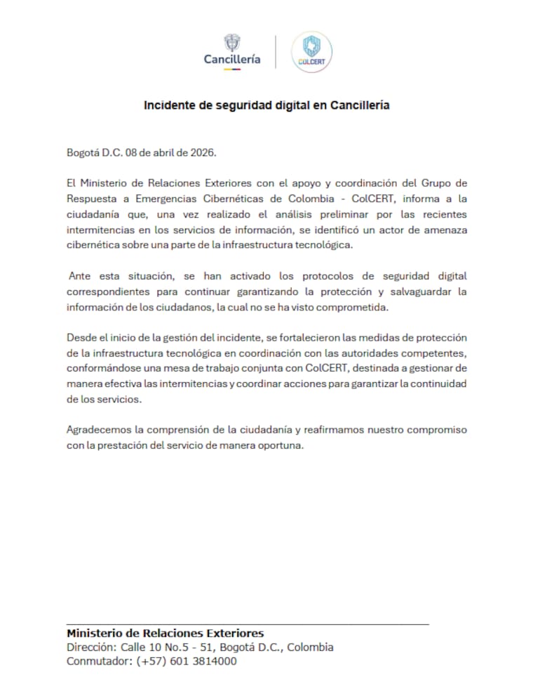 “El Ministerio de Relaciones Exteriores con el apoyo y coordinación del Grupo de Respuesta a Emergencias Cibernéticas de Colombia (ColCERT) informa a la ciudadanía que, una vez realizado el análisis preliminar por las recientes intermitencias en los servicios de información, se identificó un actor de amenaza cibernética sobre una parte de la infraestructura tecnológica”, se lee en el comunicado.