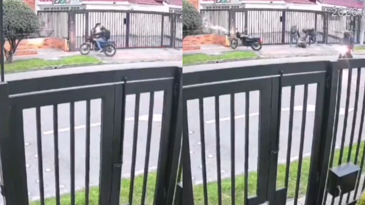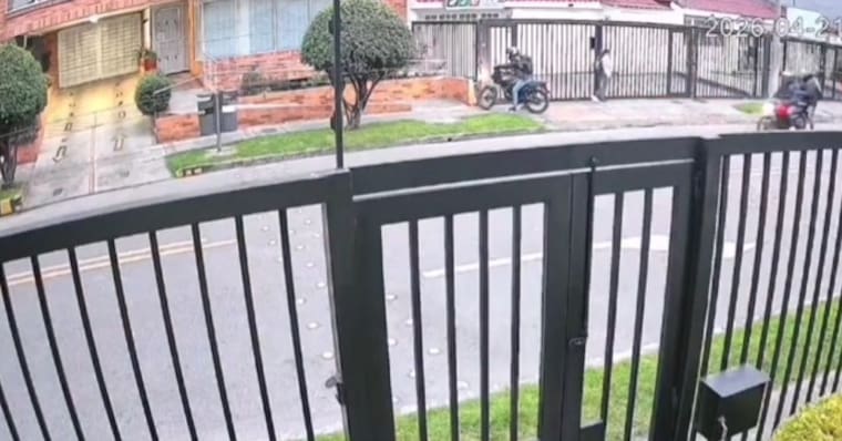 Uno de los vehículos se sube al andén y se ubica detrás de la víctima, mientras la segunda motocicleta se posiciona al frente, bloqueando cualquier intento de escape.