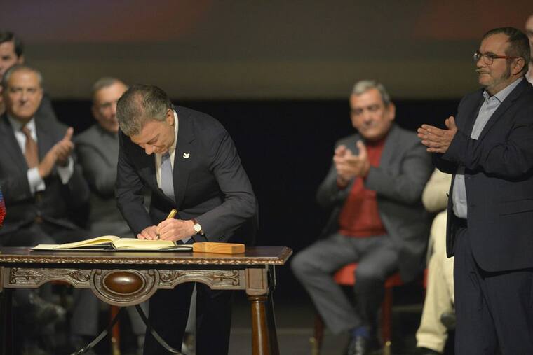 El 26 de septiembre –en un acto protocolario en Cartagena, al que asistieron líderes políticos y gobernantes de diferentes partes del mundo– el presidente Juan Manuel Santos y el máximo representante de las Farc, Rodrigo Londoño, alias Timochenko, estamparon su firma en el documento de 297 páginas que contemplaba lo que suponía el fin de la guerra: el Acuerdo de Paz.