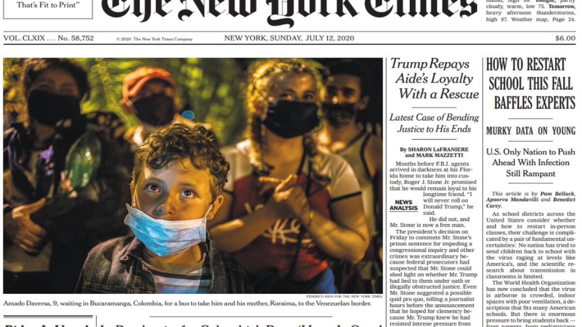 En el mensaje, se puede observar un fragmento de la portada de la edición impresa de The New York Times del 12 de julio de 2020, en el que se encuentra la fotografía de un niño con un tapabocas, captada en Bucaramanga por el fotógrafo Federico Ríos, acompañada de un pie de página que describe el éxodo inverso de refugiados venezolanos en medio de la pandemia del COVID-19 y debajo de este, un artículo titulado 'En pandemia, para los pobres de Colombia, la esperanza ha terminado'.