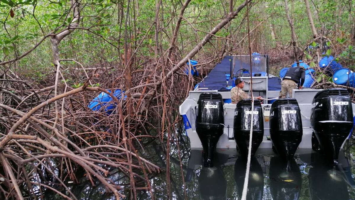 'Una operación conjunta permitió que a través de nuestras unidades del @SENANPanama y la @ArmadaColombia lograran la incautación de varios bultos de supuesta droga y armas de fuego, que iban a bordo de dos lanchas rápidas al Sur de Isla Popa', señaló la Aeronaval en su Twitter.