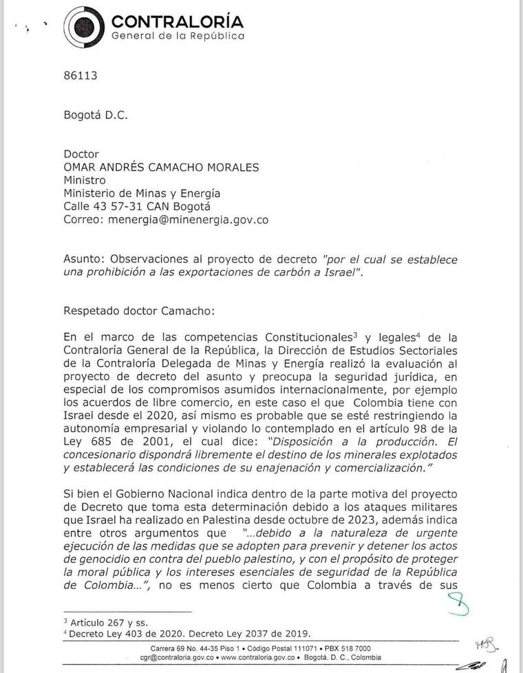 Durante la mañana de este lunes, 17 de junio, el contralor General Carlos Mario Zuluaga envió una dura misiva al Ministerio de Energía, en la cual advirtió sobre las posibles implicaciones negativas que podría traer consigo la implementación del borrador del decreto mediante el cual el Gobierno Nacional pretende prohibir las exportaciones de carbón a Israel.