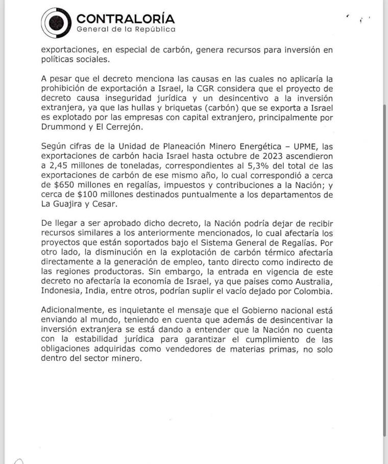 En este mismo sentido, el contralor Zuluaga sostuvo que esta prohibición solo terminaría afectando la economía nacional, teniendo en cuenta que países como Australia, Indonesia e India, pueden suplir el faltante de carbón en Israel.