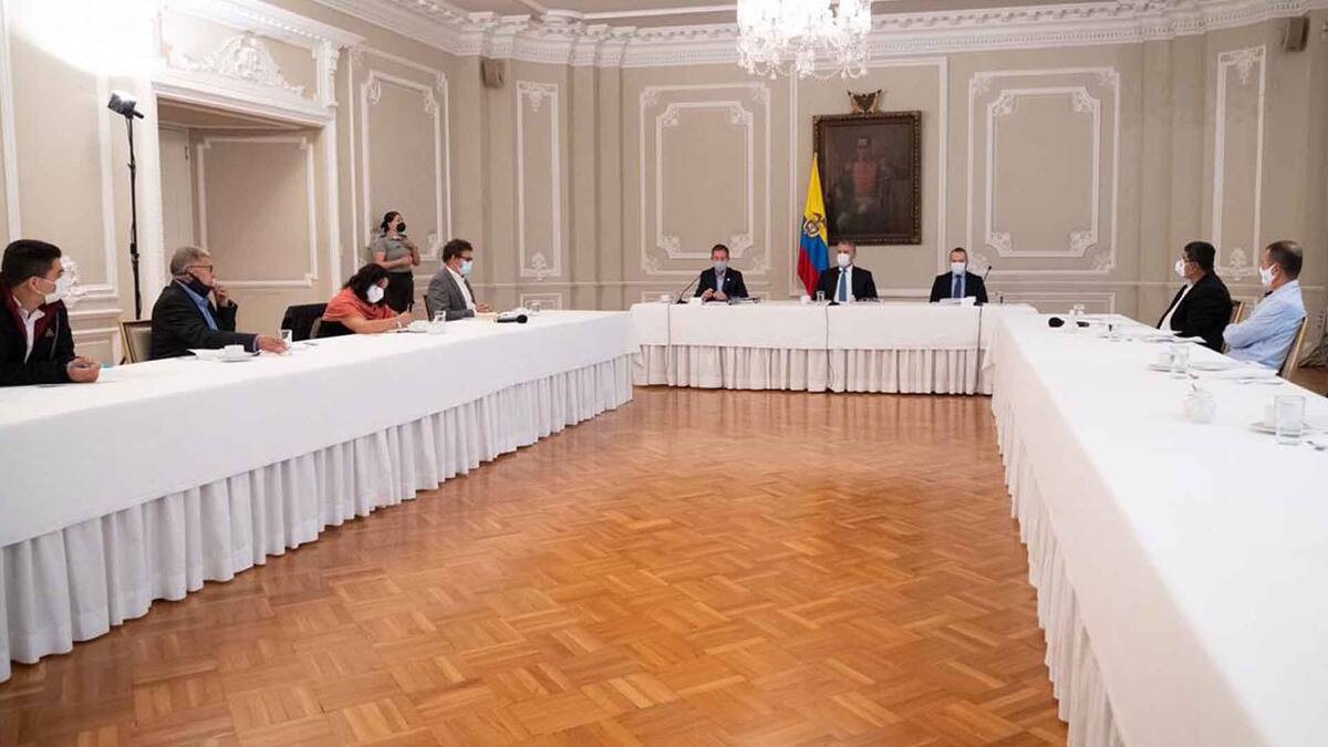 Al inicio de la 'reunión de trabajo', como la calificó el presidente Iván Duque, el mandatario indicó en Twitter: 'Les reiteramos voluntad del Gobierno de construir #PazConLegalidad. Exponemos avances en municipios PDET y la decisión de adelantar recursos de regalías, que se iban a invertir en 7 años, para ejecutarlos en 2'.