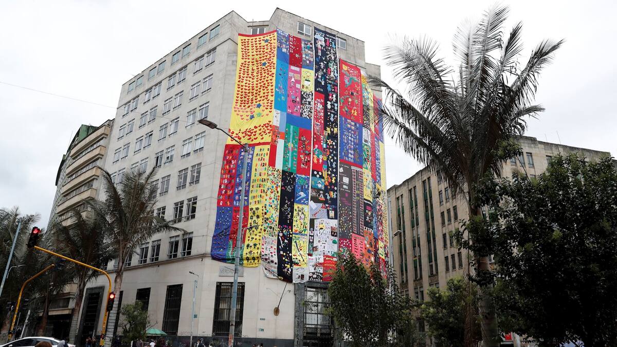 Las víctimas del conflicto, tomaron aguja e hilo para contar mediante bordados su verdad, cubriendo el edificio de la Comisión de la Verdad en Bogotá.