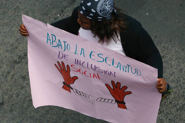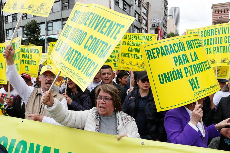 Una manifestante porta un cartel en una marcha con motivo del Día Internacional de los Trabajadores este miércoles, en Cali.  Carlos Ortega/EFEEn esta imagen aparece la senadora Aída Avella gritando consignas.
