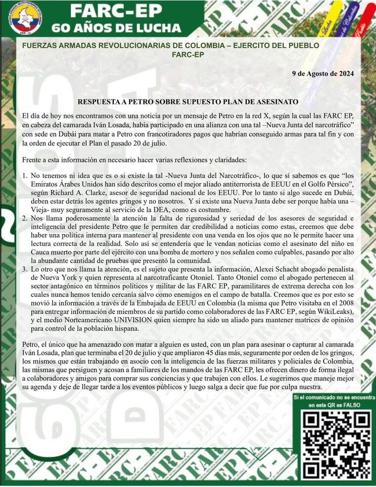 Agregan: “El único que ha amenazado con matar a alguien es usted, con un plan para asesinar o capturar al camarada Iván Losada, plan que terminaba el 20 de julio y que ampliaron 45 días más, seguramente por orden de los gringos, los mismos que están trabajando en asocio con la inteligencia de las fuerzas militares y policiales de Colombia”.