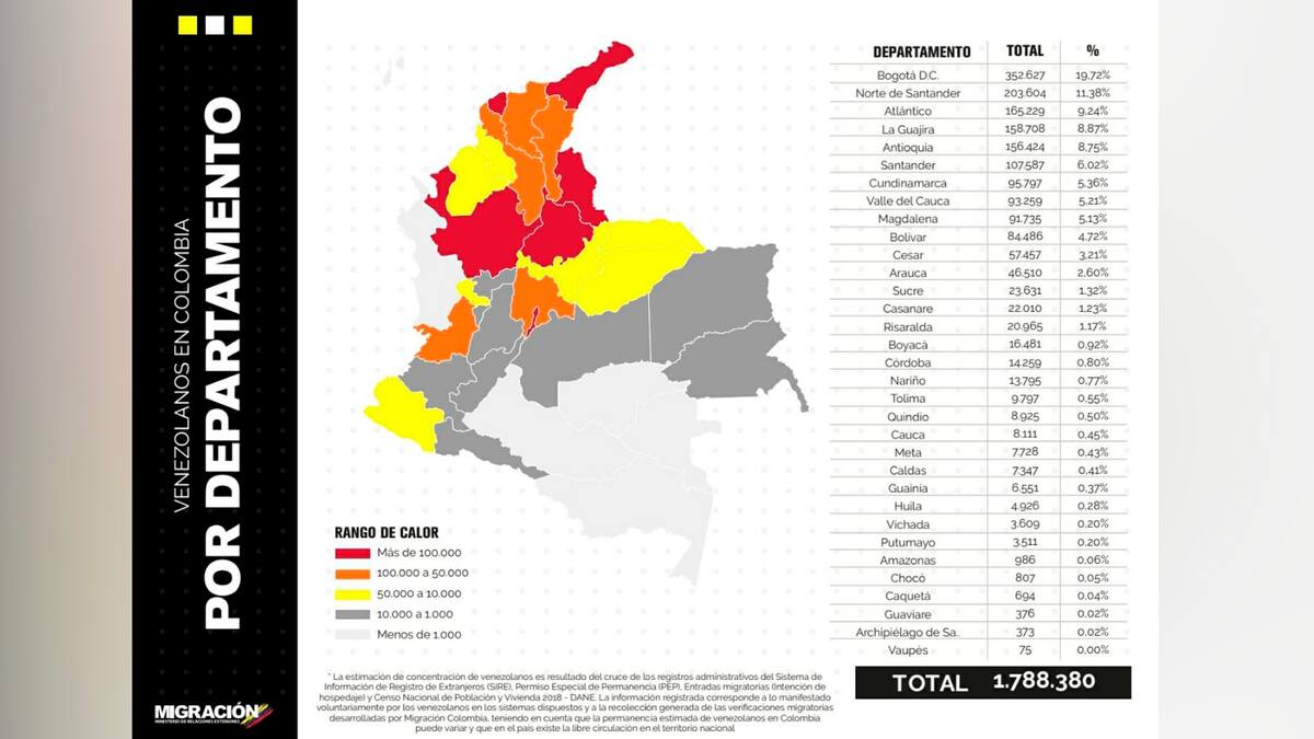 A través de un comunicado, el funcionario indicó que al 30 de abril de 2020, la cifra de venezolanos radicados en Colombia sería de 1.780.380, un uno por ciento menos que los que se encontraban a finales del mes de marzo pasado.