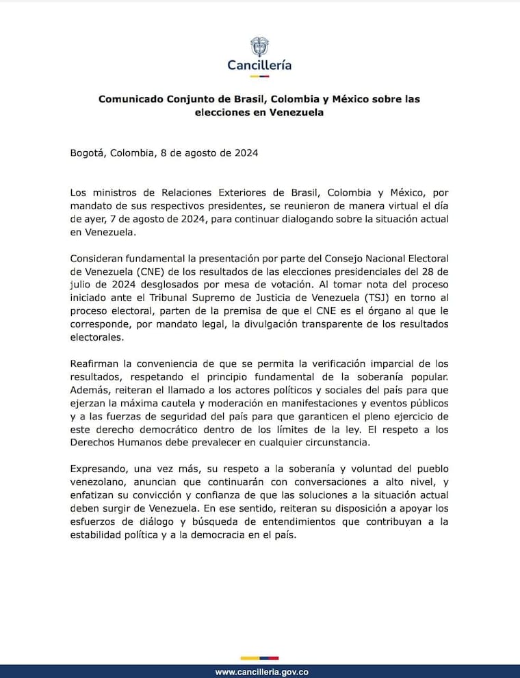 Los países en mención 'consideran fundamental la presentación por parte del Consejo Nacional Electoral de Venezuela (CNE) de los resultados de las elecciones presidenciales del 28 de julio de 2024 desglosados por mesa de votación. Al tomar nota del proceso iniciado ante el Tribunal Supremo de Justicia de Venezuela (TSJ) en torno al proceso electoral, parten de la premisa de que el CNE es el órgano al que le corresponde, por mandato legal, la divulgación transparente de los resultados electorales'.